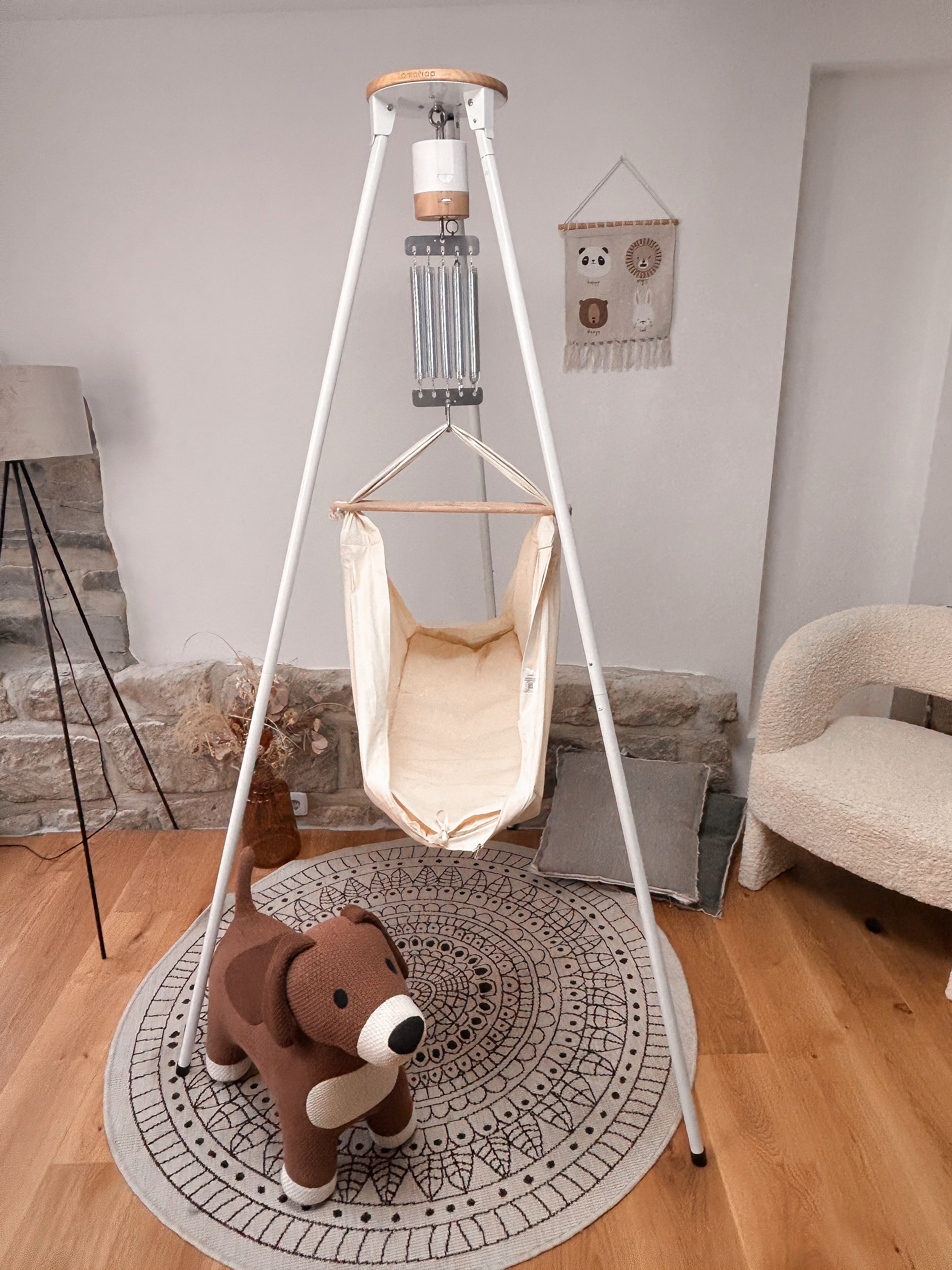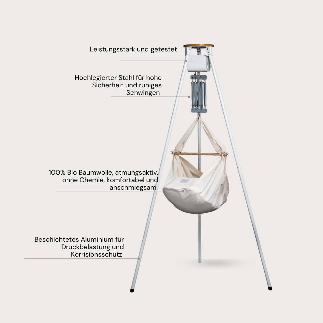 Die Federwiege verfügt über ein stabiles dreibeiniges Gestell mit einer sicheren Aufhängung, die eine maximale Belastung gewährleistet und gleichzeitig für die Sicherheit deines Babys sorgt. Mit seinem platzsparenden Design kann die Federwiege leicht in jedem Raum aufgestellt oder aufgehängt werden. Sie ist tragbar und einfach zu montieren, sodass du sie problemlos mitnehmen kannst, wenn du unterwegs bist oder deine Umgebung wechselst.