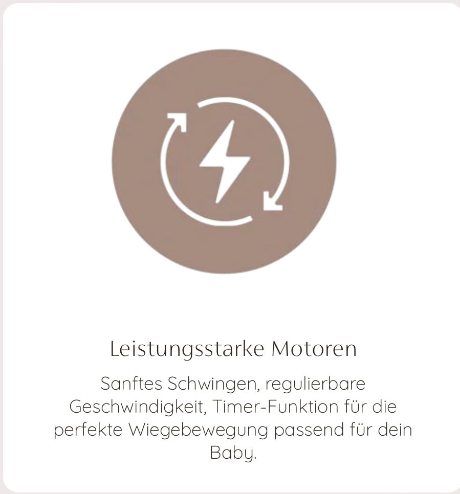 Unsere elektrischen Motoren wurden speziell für ein sanftes Wiegen entwickelt. Mit anpassbarer Wiegegeschwindigkeit und einem Timer bieten sie eine maßgeschneiderte Lösung für den perfekten Schlaf deines Babys. Qualität, die man spürt und sieht.